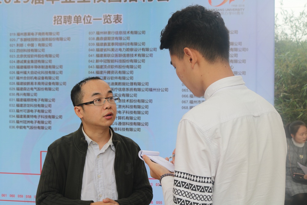 为切实做好2019届毕业生的就业工作,拓展高质量的就业渠道,10月17日下午,言情小说 数学与数据科学学院、计算机与控制工程学院、言情小说 和美术学院四院在三号教学楼联合开展了2019届毕业生校园招聘会。出席本次招聘会的领导与嘉宾有校党委陈曦副书记、校学工部朱敏副部长、仓山区人社局欧贞敏副局长、校就业指导中心郑笑还主任和相关学院的党政负责人,言情小说 院长李玉良、党委副书记鲍日元也出席了招聘会,参与招聘会还有70家校外企业和2019届毕业生。招聘会开幕式由数学与数据科学学院唐郑勇副书记主持。