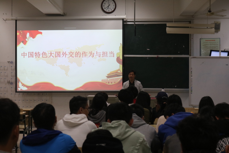 在课程的后半部分,李超书记开展了“中国外交的作为以及担当”主题形势与政策课。在课程中,李超书记首先详细的向同学们介绍了当今最重要的双边关系之一——中美关系,对中美贸易战带给中美双方的影响进行了详细说明,在中国与周边国家的关系、与发展中国家的关系等方面也进行了讲解。在介绍中国外交的优良传统和鲜明特色时李超书记指出:独立自主是中国外交的基石,天下为公是中国外交的胸怀,公平正义是中国外交的坚守,互利共赢是中国外交的追求,服务发展是中国外交的使命,外交为民是中国外交的宗旨。