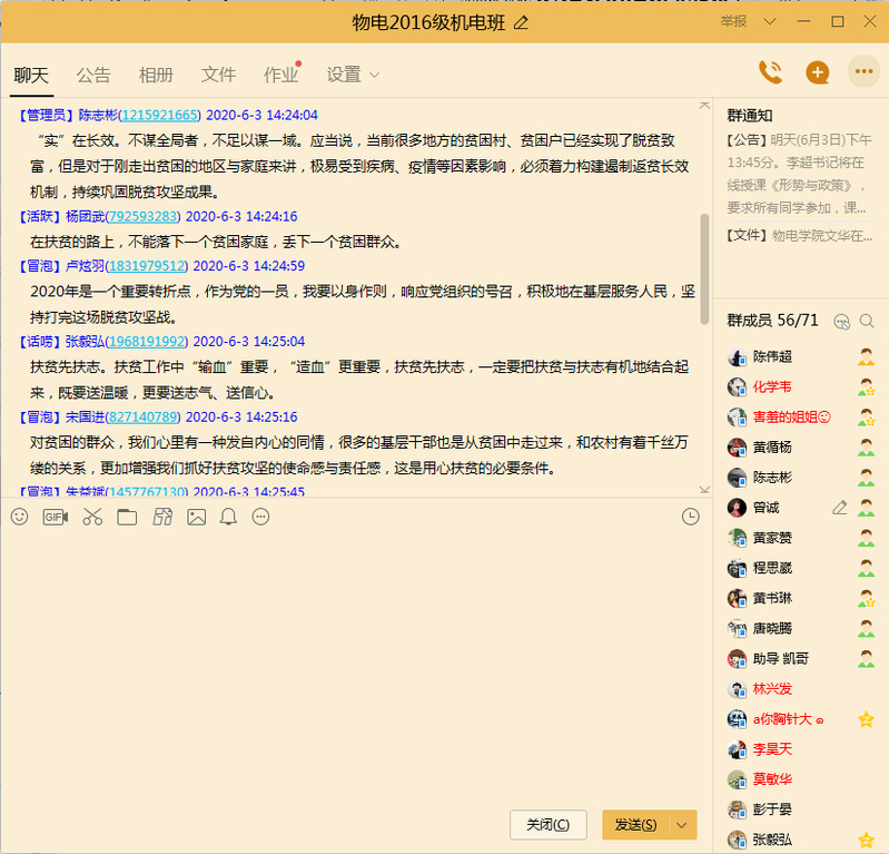 课程后半段,李超书记与全体学生进行了线上互动,加深了学生们对于课程内容的理解与认识,毕业生就如何打赢脱贫攻坚战也展开了激烈的讨论。2016级机械电子工程专业学生卢炫羽认为,2020年是脱贫攻坚的关键时期,作为一名党员应该以身作则,积极响应党的号召,投身扶贫事业,积极为基层服务。2016级电子信息工程学生张秦认为,扶贫应注重“扶志扶智”,当前“扶志扶智”工作还相对落后,所以必须补齐短板,切不可掉以轻心。