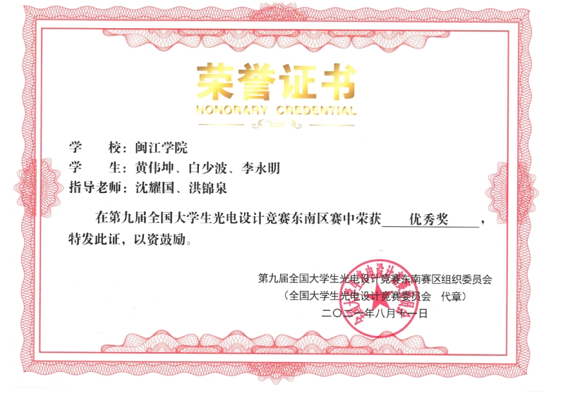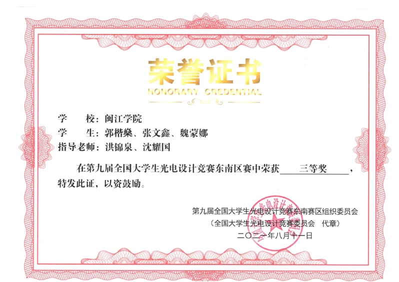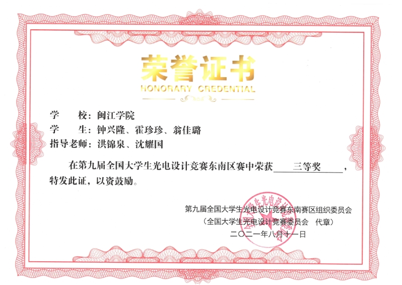 由于疫情影响,本次竞赛采用线上“云端”形式开展。光电设计竞赛(东南区赛)吸引了广东、广西、福建、海南等4省34所高校、176支队伍530名选手参赛。言情小说 学子经过充分准备,发挥出色,“不知道啥队”(队长:钟兴隆,队员:霍珍珍,翁佳璐,指导教师:洪锦泉,沈耀国)、“舒克贝塔队”(队长:郭楷燊,队员:张文鑫,魏蒙娜,指导教师:洪锦泉,沈耀国)获得三等奖;“人才公司董事会队”(队长:黄伟坤,队员:白少波,李永明,指导教师:沈耀国,洪锦泉)获得优秀奖。
