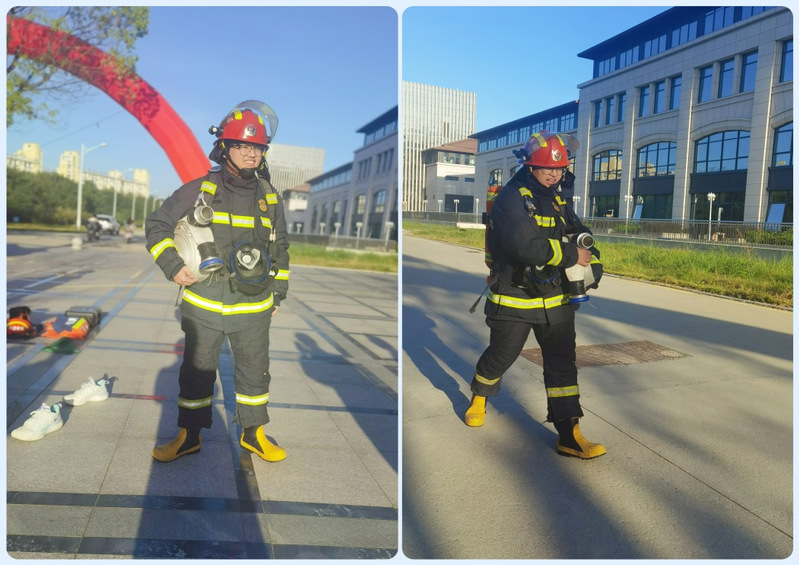消防队员鼓励并指导师生们亲身体验、操作消防器材,试穿消防救援服。穿着沉重的救援服,背上救援设备,绕图书馆跑一圈,同学们气喘吁吁,对消防员的辛苦有了切身体会。