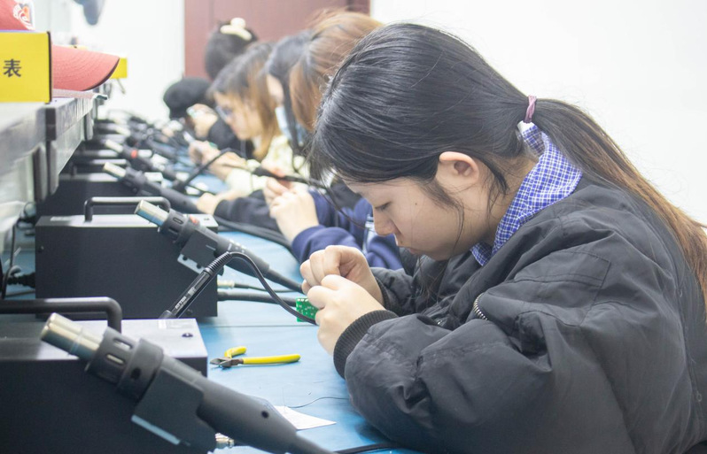 比赛现场,50 余名选手早早候场,蓄势待发。随着开赛指令下达,场内瞬间安静下来,只听得电烙铁发出的低频嗡鸣声与焊锡丝细微的轻颤声交织。选手们全神贯注,手指灵活操作,在电路板上精准定位电子元件,流畅走线,焊点如繁星般均匀散落。他们专注投入的神情与娴熟利落的动作,充分展现了扎实的专业功底,也深深感染了在场的每一位观众和评委。
