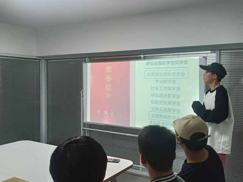 “2023-2024学年国家励志奖学金、2022-2024连续两学年校一综合等奖学金、2022-2024连续两学年文明养成奖学金”获得者周乃森解释了综测计算方法,分享了实验室和学生工作的心得,建议学生提前做好未来规划。