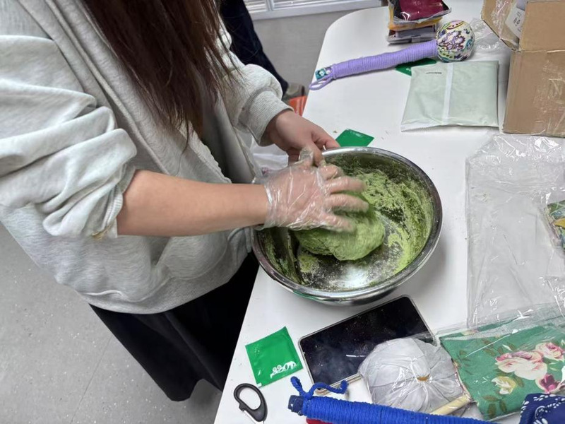 青团制作区陈列着糯米粉、麦苗汁、豆沙馅等传统食材,通过播放影片,现场演示《调鼎集》记载的三浸三揉古法。同学们分组协作,从揉制翡翠色面团到包制三角褐团,完整复刻江南清明食俗。活动现场特别设置创意青团环节,部分同学尝试融入抹茶粉、紫薯泥等现代食材,创作出渐变色的春意盎然系列作品。2024级机械电子工程专业柳丹妮同学表示:通过亲手制作才知道,青团不仅是美食,更承载着“寒食节改火”的文明演进史。艾草锤上的每个绳结,都凝结着先人的生命智慧。