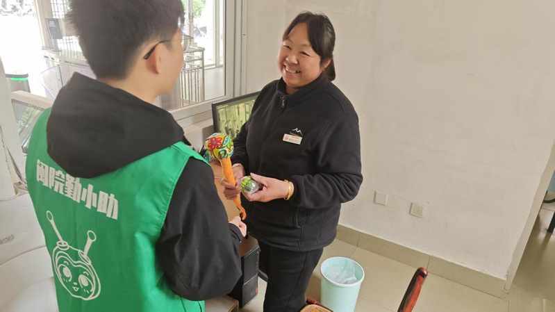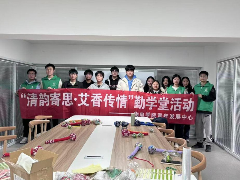 活动特别设置感恩传承环节,学生们将亲手制作的50盒翡翠青团、30个艾草锤精心包装,赠予学院宿舍管理员、校园保安等后勤服务人员。在求实社区值班室,学生代表、2023级物理学(师范类)专业程信翔向工作十多年的宿管吴阿姨送上艾草锤:这个养生锤每天巡逻时可以用,希望阿姨身体健康。吴阿姨感动地说:没想到孩子们把传统文化和感恩教育结合得这么好,锤柄上的绳结特别暖心。