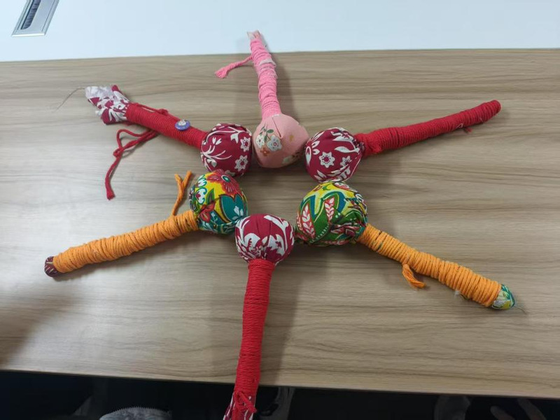 活动现场弥漫着艾草特有的清香,首先通过多媒体影像重现《清嘉录》记载的虎形艾锤制作场景。学生们在指导下将艾叶、桂枝等中药材装入粗麻布袋,运用十字缠绕法固定木柄,最终制成兼具养生功能与文化寓意的艾草锤。每一道捆扎工序都需控制力度,这让我体会到传统手作的匠心理念。2023级物理学(师范类)专业郭梓杰同学展示作品时说道。