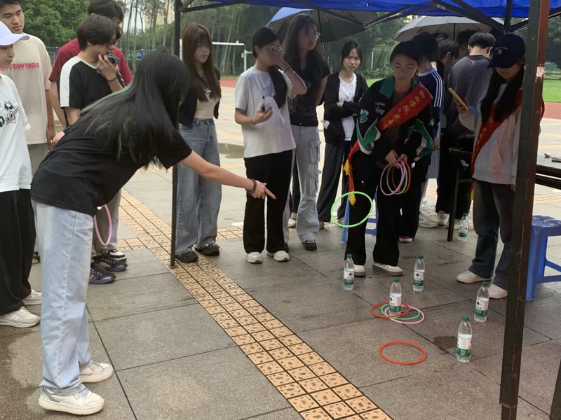 心理趣味运动会由“最精准”“最速度”“最默契”“最协调”等四个项目组成。最精准比赛有“环环相扣”“篮球高手”“眼疾手快”等环节;最速度比赛设有“四人五足”“激情赛道”等环节;最默契比赛设有“跳大绳”“杯水传情”“动力火车”等环节;最协调比赛设有“颠乒乓球”“摸石过河”环节。虽然下着小雨,同学们的热情并未受影响,赛场上的欢声笑语成了志强体育场最靓丽的风景线。