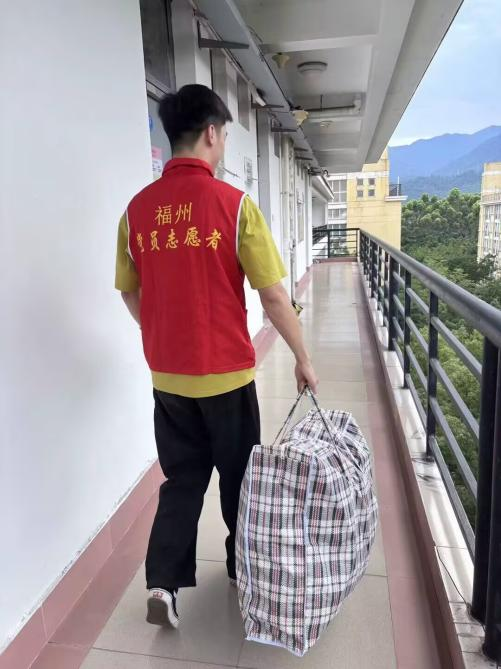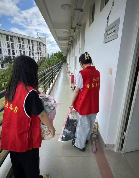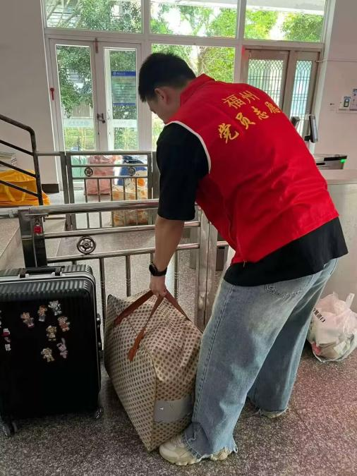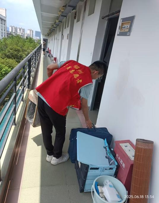 6月18日,身着红色志愿者马甲的学生党员们,早早来到毕业生宿舍,根据提前做好的分工,帮助学长学姐搬运行李上下宿舍楼,有的搬运体积庞大的行李袋,有的专注于整理零散生活用品。党员志愿者们用热情的服务和有力的双手,为毕业生们减轻离校负担。