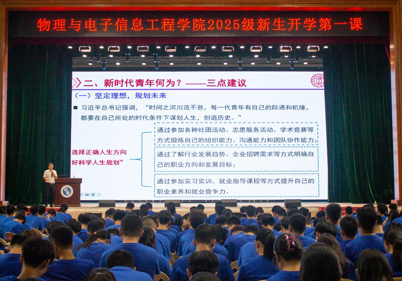英文PPT、双语授课,刘中院长的“开学第一课”,令新生们印象深刻。他聚焦学院名称“物理与电子信息工程”展开深度解读,从学科发展脉络与办学定位出发,阐释名称的由来与内涵,帮助学子们精准把握学院学科特色。同时,他讲解学院未来发展规划,为学子们的专业学习与职业规划提供清晰指引,让大家在了解学院发展蓝图的过程中,更加热爱所学专业。