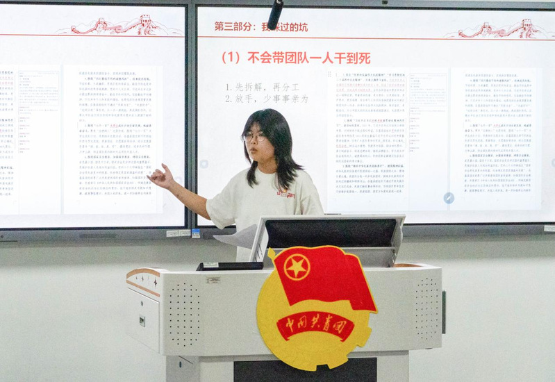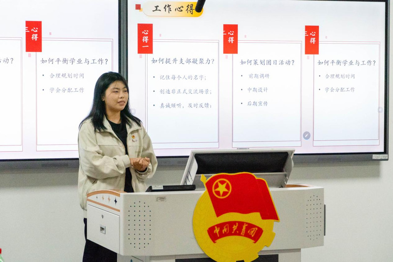 2024级机械电子工程班团支书陈珊珊以“三问”为切入点,分享了“冬至志愿打卡”“烟台山公益”等优秀活动案例,强调活动开展需多方联动、明确分工,并指出团支书应具备“开口能讲、提笔能写”的能力以及强大的抗压能力。