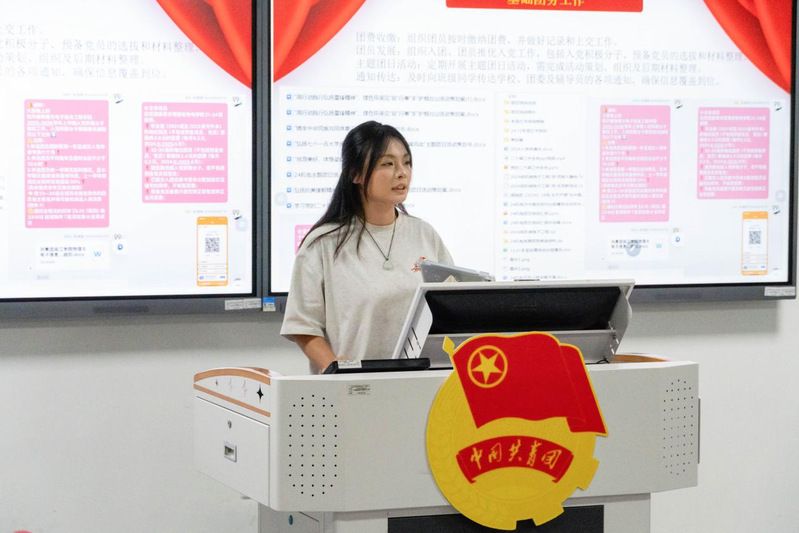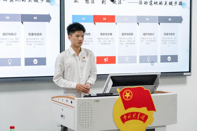 2024级电气工程及其自动化2班团支书张黄清围绕“如何打造活力团支部”这一主题,强调班级团支书需要打破固有认知,主动转型为活动设计师与支部连接器。他分享了信息标注、人工智能撰写通知、数字化管理台账等方法,提出“团三角”团队分工模式,并以“共享厨房”活动为例,建议如何以喜闻乐见的形式开展团日活动。