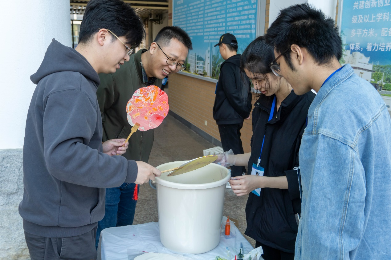 在乒乓球掷准区,老师们凝神聚力,瞄准目标投掷;筷子夹球关卡前,大家小心翼翼地用筷子夹起乒乓球,在规定时间内奋力完成转移任务;飞镖大战里,选手们站姿稳健、瞄准投掷,每一次命中高分区域都引来阵阵喝彩;盲人击鼓关卡充满趣味性,蒙眼旋转后的老师在同伴的加油声中摸索前进,成功击中鼓面时的喜悦溢于言表;非遗艺术、漆扇手作深受欢迎,老师们化身“漆艺师”,精心调制颜色,小心翼翼地把素面扇浸入其中,待扇面把颜料吸牢再缓缓提起,就收获独一无二的漆扇一枚。
